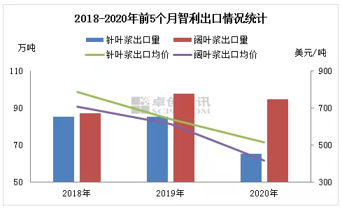 引言:2020年公共衛(wèi)生事件導(dǎo)致全球紙漿市場不確定性增強,智利作為紙漿主要生產(chǎn)國及中國針葉漿和闊葉漿的主要來源國,通過分析2020年前5個月智利海關(guān)出口數(shù)據(jù),發(fā)現(xiàn)智利紙漿出口結(jié)構(gòu)及流向出現(xiàn)新的趨勢。 1.出口結(jié)構(gòu):供需面同時作用 闊葉漿比例增加