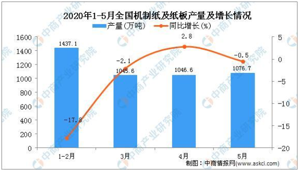 根據(jù)中國輕工業(yè)信息中心數(shù)據(jù)顯示,2020年1-5月,全國機制紙及紙板產(chǎn)量4636.2萬噸,同比下降6.8%。5月當月,全國機制紙及紙板產(chǎn)量1076.7萬噸,同比下降0.5%。