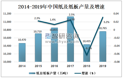 一、概況 新聞紙又稱白報紙,是報刊及書籍的主要用紙。適用于報紙、期刊、課本、連環畫等正文用紙。新聞紙的特點有:紙質松輕、有較好的彈性;吸墨性能好,這就保證了油墨能較好地固著在紙面上。 含有大量的木質素和其他雜質,不宜長期存放。保存時間過長,紙張會發黃變脆,抗水性能差,不宜書寫等。必須使用印報油墨或書籍油墨,油墨粘度不要過高,平版印刷時必須嚴格控制版面水分。由于其所用原材料以機械木漿為主,含有本質素及雜質,所以紙張不宜長期保存,而且容易破損。2019年中國紙及紙板產量為10765萬噸,同比增加3.2%,其中新聞紙占比1.39%。 2014-2019年中國紙基紙板產量及增速