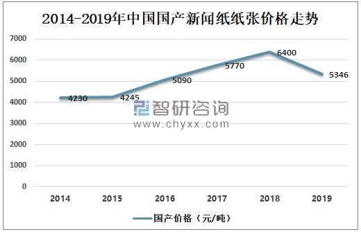 數據來源:智研咨詢整理 4、價格走勢 面對報紙用紙量減少,新聞紙市場供大于求,價格一路走低,2010-2019年,我國新聞紙價格水平在4000/噸-6500/噸之間波動,自2015年新聞紙價格不斷攀升,于2018年末達到高點,隨后又逐漸下降。2019年,我國新聞紙價格降至5346元/噸。 2014-2019年中國國產新聞紙紙張價格走勢