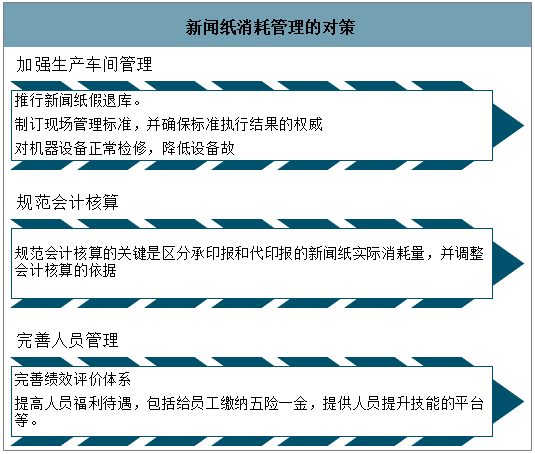 數據來源:智研咨詢整理 三、新聞紙消耗存在問題及解決方式 印刷結束后剩余新聞紙沒有辦理退庫,以新聞紙出庫量作為實際消耗量.虛增了新聞紙消耗量,易造成浪費。 隨意印前領用的新聞紙由物資部提前擺放到生產車間、剩余新聞紙也在生產車間存放,生產車間現場管理的標準寬松,或者標準執行不嚴格,地面臟亂衛生沒有及時打掃、人員隨意進出等,很容易造成新聞紙外皮刮擦等,形成廢紙,虛增新聞紙消耗量。 定額管理有效與否關鍵在于定額是否合理,定額制訂是需要多部門博弈、協商,受多個因素的影響.例如印量、新聞紙質量、人員技能水平的不同都會影響定額。 新聞紙消耗存在問題