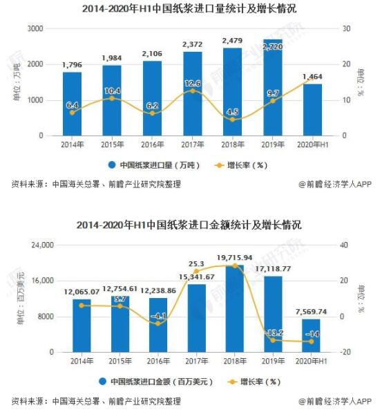 據中國海關總署統計數據顯示,2019年去年中國紙漿進口量達到了2720萬噸,累計增長9.7%。截止至2020年6月中國紙漿進口量為249萬噸,同比增長1.3%。累計方面,2020年1-6月中國紙漿進口量達到1464萬噸,相比上年同期增長了205萬噸,累計增長16.3%。