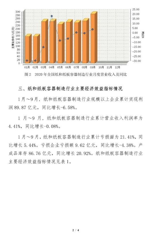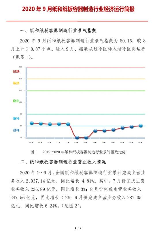 11月16日,中國包裝聯合會公布了2020年9月紙和紙板容器行業經濟運行簡報。數據顯示,9月份,紙和紙板容器制造行業景氣指數為80.15,較8月份上升了0.87個點。同時,指數從過冷區轉入漸冷區運行,景氣度持續向好。 在經營數據方面,1-9月份,全國紙和紙板容器制造行業累計完成營收2037.14億元,同比下滑4.81%;紙和紙板容器制造行業規模以上企業累計實現利潤89.87億元,同比下滑6.58%。 1-9月份,紙和紙板容器制造行業累計虧損面為21.41%,同比增長5.44%。虧損企業虧損額9.62億元,同比下滑4.38%。產成品庫存86.76億元,同比增長20.92%。