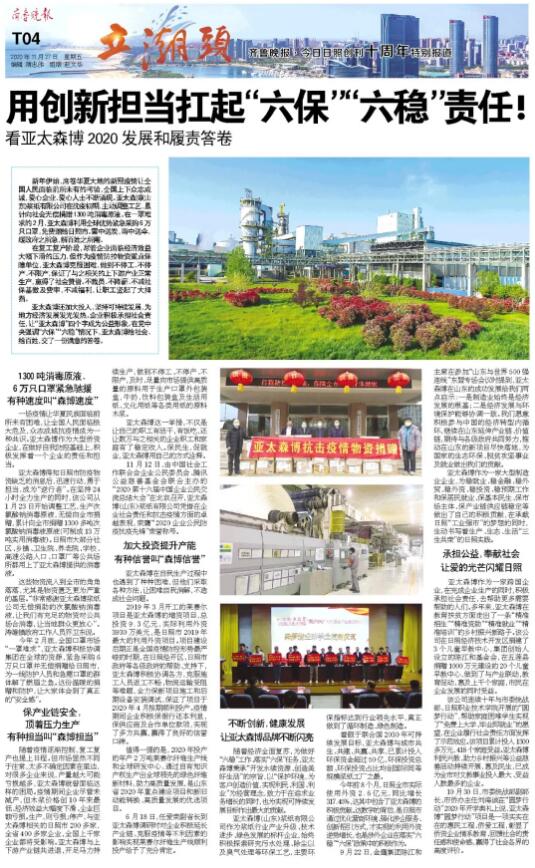 這些物資流入到全市的角角落落,尤其是物資匱乏更為嚴重的基層。“非常感謝亞太森博漿紙公司無償捐助的次氯酸鈉消毒液,讓我們有充足的物資對公共場合消毒,讓當地群眾更放心”。濤雒鎮政府工作人員喬衛東說。 今年2月底,全國口罩市場“一罩難求”,亞太森博積極協調集團在全球的資源,緊急采購6萬只口罩并無償捐贈給日照市,為一線防護人員和急需口罩的群體解了燃眉之急。這份溫暖的捐贈和防護,讓大家體會到了真正的“安全感”。 保產業鏈安全,頂著壓力生產 有種擔當叫“森博擔當” 隨著疫情逐漸控制,復工復產也提上日程。但市場顯然不同于往常,太多不確定因素在里邊,對很多企業來說,產量越大可能虧損越多,亞太森博就曾面臨這樣的困局。疫情期間企業盡管未減產,但木漿價格創10年來最低、經濟效益大幅度下滑、企業巨額虧損。生產,則虧損;停產,與亞太森博相關的日照市200多家,全省400多家企業,全國上千家企業都將受影響。亞太森博與上下游產業鏈共進退,開足馬力持續生產,做到不停工、不停產、不限產,及時、足量向市場提供高質量的原料用于生產口罩外包裝盒,牛奶、飲料包裝盒及生活用紙、文化用紙等各類用紙的原料木漿。 亞太森博這一舉措,不僅是讓自己的職工有活干,有飯吃,還讓數萬與之相關的企業職工和家庭有了穩定收入。保民生,促就業,亞太森博用自己的方式詮釋。 11月12日,由中國社會工作聯合會企業公民委員會、騰訊公益慈善基金會聯合主辦的“2020第十六屆中國企業公民交流總結大會”在北京召開,亞太森博(山東)漿紙有限公司憑借在企業社會責任和抗擊疫情方面的卓越表現,榮膺“2020企業公民防疫抗疫先鋒”榮譽稱號。 加大投資提升產能 有種信譽叫“森博信譽” 亞太森博在自我生產過程中也遇到了種種困難,但他們采取各種方法,讓困難自我消解,不造成社會問題。 2019年3月開工的萊賽爾項目是亞太森博的增資項目,總投資9.3億元,實際利用外資3930萬美元,是日照市2019年最大的利用外資項目。項目建設后期正是全國疫情防控形勢最嚴峻的時期,在日照經開區、日照市政府等各級政府的幫助、支持下,亞太森博積極協調各方,克服施工人員返工不暢、物流運輸受阻等難題,全力保新項目施工和后期設備安裝調試,保證了項目于2020年4月按期順利投產。疫情期間企業積極保銀行還本利息,保供應商及合作單位款項,實現了多方共贏,贏得了良好的信譽口碑。 值得一提的是,2020年投產的年產2萬噸萊賽爾纖維生產線和全球研發中心,通過自有知識產權生產出全球領先的綠色纖維新材料,助力高質量發展,是山東省2020年重點建設項目和新舊動能轉換、高質量發展的優選項目。 6月18日,任愛榮副省長到亞太森博調研時對企業積極延長產業鏈、克服疫情等不利因素的影響實現萊賽爾纖維生產線順利投產給予了充分肯定。 不斷創新,健康發展 讓亞太森博品牌不斷閃亮 隨著經濟全面復蘇,為做好“六穩”工作、落實“六!比蝿,亞太森博秉承“開發永續資源、創造美好生活”的宗旨,以“保護環境,為客戶創造價值,實現利民、利國、利業”為經營理念,致力于在追求業務增長的同時,也為實現可持續發展目標作出最大的貢獻。 亞太森博(山東)漿紙有限公司作為漿紙行業產業升級、技術進步、綠色發展的標桿企業,始終積極探索研究污水處理、除塵以及臭氣處理等環保工藝,主要環保指標達到行業領先水平,真正做到了循環制造、綠色制造。 著眼于聯合國2030年可持續發展目標,亞太森博與城市共生、共建、共贏、共享,已累計投入環保資金超過50億,環保投資總額、環保投資占比均創國際同等規模漿紙工廠之最。 今年前8個月,日照全市實際使用外資2.6億元,同比增長317.45%,這其中包含了亞太森博的積極貢獻。這數字的背后,是日照市通過優化營商環境、強化涉企服務、創新招引方式,才實現的利用外資逆勢增長,也是涉外企業在落實“六穩”“六!闭咧械姆e極作為。 9月22日,金鷹集團陳江和主席在參加“山東與世界500強連線”東盟專場會議時提到,亞太森博在山東的成功發展給我們兩點啟示:一是制造業始終是經濟發展的根基;二是經濟發展與環境保護能夠協調一致。我們愿意積極參與中國的經濟轉型內循環,繼續在山東延伸產業鏈、價值鏈,期待與各級政府共同努力,推動在山東的新項目盡快落地,為國家的生態環保、脫貧攻堅事業及就業做出我們的貢獻。 亞太森博作為一家大型制造業企業,為穩就業、穩金融、穩外貿、穩外資、穩投資、穩預期工作和保居民就業、保基本民生、保市場主體、保產業鏈供應鏈穩定等做出了自己的積極貢獻,在承載日照“工業強市”的夢想的同時,生動書寫著生產、生態、生活“三生共榮”的日照實踐。 承擔公益,奉獻社會 讓愛的光芒閃耀日照 亞太森博作為一家跨國企業,在完成企業生產的同時,積極承擔社會責任,去幫助更多需要幫助的人們。多年來,亞太森博在教育扶貧方面走出了一條“精準招生”“精準資助”“精準就業”“精準培訓”的鄉村振興新路子。該公司在日照經濟技術開發區捐建了3個兒童早教中心;集團創始人設立的陳江和基金會,在五蓮縣捐贈1000萬元建設的20個兒童早教中心,做到了與產業聯動,教育促動,惠及上千個家庭,市民在企業發展的同時受益。 該公司連續十年