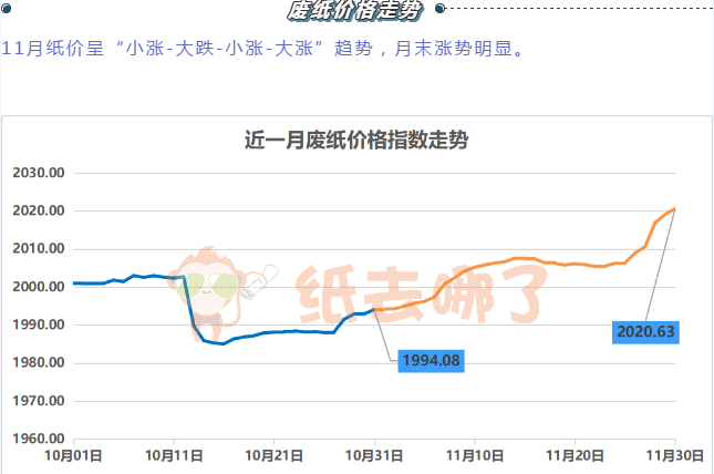 導(dǎo)語:12月2日全國國廢黃板紙市場小幅探漲,北方地區(qū)補(bǔ)漲為主,太康龍?jiān)瓷险{(diào)30,山東地區(qū)濰坊匯勝、世紀(jì)陽光都有上漲。南方福建地區(qū)龍頭紙企華南山鷹、聯(lián)盛、三星上調(diào)30-50,廣東以及江浙地區(qū)零星調(diào)整。國廢市場幾日來皆以小幅上漲為主,各紙廠觀望氣氛濃厚。后期走勢多以平穩(wěn)向好發(fā)展,建議各商家進(jìn)出貨保持隨進(jìn)隨出。 11月廢紙?jiān)聢?bào)  截至11月30日上午,廢紙價(jià)格指數(shù)為2020.63,相比10月31日的1994.08,上漲了26.55點(diǎn)。 廢紙的回漲基本回應(yīng)了兩方面的市場期待: 1)外廢全面“清零”國內(nèi)造紙廠將在廢紙端爭奪越加激烈,行業(yè)集中度恐進(jìn)一步提高! 2)用廢紙的全面回漲支撐原紙的價(jià)格遏制可能的下降趨勢。 11月25日,生態(tài)環(huán)境部、商務(wù)部、國家發(fā)展和改革委員會、海關(guān)總署發(fā)布《關(guān)于全面禁止進(jìn)口固體廢物有關(guān)事項(xiàng)的公告》(下稱《公告》)稱,禁止以任何方式進(jìn)口固體廢物,禁止我國境外的固體廢物進(jìn)境傾倒、堆放、處置。公告自2021年1月1日起施行。 隨后的11月27日,該條消息已迅速攀上微博熱搜榜,引發(fā)網(wǎng)友熱議。