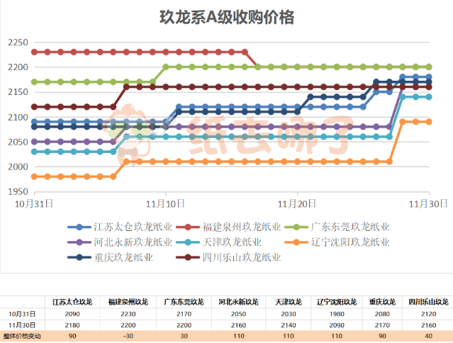 截至11月30日,玖龍系A(chǔ)級以福建和廣東玖龍同為最高,為2200元/噸;遼寧玖龍最低,為2090元/噸。 黃板紙價(jià)格走勢 以下為11月部分紙廠黃板紙采購價(jià)格對比。