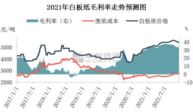 圖2 2021年白卡紙毛利率走勢預(yù)測圖 如圖所示,2017-2018年白卡紙價格呈現(xiàn)震蕩上漲的態(tài)勢, 2018年二季度開始下降,2019年一季度個別月份紙廠漿價小幅上行,而紙價下行,紙廠虧損。2019年下半年開始,漿價連續(xù)下行,白卡紙市場格局良好,紙價開啟上行通道,企業(yè)利潤有所增加。 2020年下半年開始白卡紙迎來行業(yè)景氣周期,另外產(chǎn)能集中度進一步提升,紙廠話語權(quán)加重,紙價連續(xù)拉漲,紙廠利潤大幅增加。 卓創(chuàng)預(yù)計2021年白卡紙價格持續(xù)上行,而2021年全球經(jīng)濟回暖背景下針葉漿未來三年沒有新產(chǎn)能投放,價格處于上行通道,但受闊葉漿影響預(yù)計不會有很大漲幅;闊葉漿目前供過于求,明年有部分新產(chǎn)能,價格大漲可能非常小。 卓創(chuàng)認為白卡紙規(guī)模紙廠多屬于漿紙一體化,消耗量占比最多的化機漿以紙廠自產(chǎn)為主,預(yù)計2021年三季度之前尚無新增產(chǎn)能,同時受漿價對紙價影響偏弱影響,紙廠利潤繼續(xù)增加。 觀點: 從原料方面來說,卓創(chuàng)認為白板紙與原料相關(guān)性增加,但不是唯一,除了受供應(yīng)端收緊影響,廢紙偏強震蕩以及原料替代品帶來的成本端增加,另外還將受白卡紙規(guī)模紙廠連續(xù)推漲帶動帶來的提漲刺激; 白卡紙或?qū)⑴c原料一致性再次減弱,主因市場供應(yīng)僅在3季度以后有所增加,而需求受經(jīng)濟恢復(fù)、出口增加、政策推動較強,此外產(chǎn)能集中度較高的行業(yè)格局同樣成為紙價提漲的利好推動。