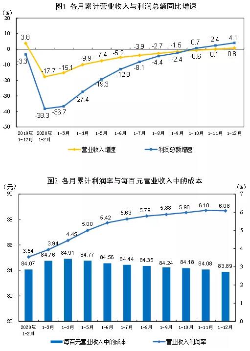 2020年,規(guī)模以上工業(yè)企業(yè)實(shí)現(xiàn)營(yíng)業(yè)收入106.14萬億元,比上年增長(zhǎng)0.8%;發(fā)生營(yíng)業(yè)成本89.04萬億元,增長(zhǎng)0.6%;營(yíng)業(yè)收入利潤(rùn)率為6.08%,比上年提高0.20個(gè)百分點(diǎn)。其中,造紙和紙制品業(yè)實(shí)現(xiàn)營(yíng)業(yè)收入13012.7億元,同比下降2.2%;印刷和記錄媒介復(fù)制業(yè)實(shí)現(xiàn)營(yíng)業(yè)收入6472.3億元,同比下降5.2%。 2020年末,規(guī)模以上工業(yè)企業(yè)資產(chǎn)總計(jì)126.76萬億元,比上年末增長(zhǎng)6.7%;負(fù)債合計(jì)71.06萬億元,增長(zhǎng)6.1%;所有者權(quán)益合計(jì)55.70萬億元,增長(zhǎng)7.4%;資產(chǎn)負(fù)債率為56.1%,比上年末下降0.3個(gè)百分點(diǎn)。 2020年末,規(guī)模以上工業(yè)企業(yè)應(yīng)收賬款16.41萬億元,比上年末增長(zhǎng)15.1%;產(chǎn)成品存貨4.60萬億元,增長(zhǎng)7.5%。 2020年,規(guī)模以上工業(yè)企業(yè)每百元營(yíng)業(yè)收入中的成本為83.89元,比上年減少0.11元;每百元營(yíng)業(yè)收入中的費(fèi)用為9.17元,比上年增加0.14元。 2020年末,規(guī)模以上工業(yè)企業(yè)每百元資產(chǎn)實(shí)現(xiàn)的營(yíng)業(yè)收入為87.8元,比上年末減少5.0元;人均營(yíng)業(yè)收入為145.0萬元,比上年末增加5.5萬元;產(chǎn)成品存貨周轉(zhuǎn)天數(shù)為17.9天,比上年末增加1.2天;應(yīng)收賬款平均回收期為51.2天,比上年末增加5.8天。 2020年12月份,規(guī)模以上工業(yè)企業(yè)實(shí)現(xiàn)利潤(rùn)總額7071.1億元,同比增長(zhǎng)20.1%,增速比11月份加快4.6個(gè)百分點(diǎn)。 國(guó)家統(tǒng)計(jì)局工業(yè)司高級(jí)統(tǒng)計(jì)師朱虹表示,2020年,工業(yè)企業(yè)效益持續(xù)改善:企業(yè)利潤(rùn)逐季回升,單月連續(xù)7個(gè)月較快增長(zhǎng);利潤(rùn)增長(zhǎng)面超過六成,制造業(yè)拉動(dòng)作用明顯;單位成本連續(xù)下降,盈利能力有所增強(qiáng);企業(yè)虧損面逐季縮小,虧損程度不斷減輕。 分季度看,今年利潤(rùn)呈現(xiàn)“由負(fù)轉(zhuǎn)正、逐季加快”的走勢(shì)。受疫情嚴(yán)重沖擊影響,一季度利潤(rùn)同比大幅下降36.7%,隨著“六穩(wěn)”“六!比蝿(wù)不斷落實(shí)落細(xì),企業(yè)復(fù)工復(fù)產(chǎn)水平穩(wěn)步提升,二季度利潤(rùn)增長(zhǎng)4.8%,增速實(shí)現(xiàn)由負(fù)轉(zhuǎn)正,三季度增速回升至15.9%,四季度進(jìn)一步加速至20.8%。12月份,規(guī)模以上工業(yè)企業(yè)利潤(rùn)同比增長(zhǎng)20.1%,增速比11月加快4.6個(gè)百分點(diǎn),繼5月份實(shí)現(xiàn)月度增速由負(fù)轉(zhuǎn)正后,連續(xù)7個(gè)月保持兩位數(shù)增長(zhǎng)。