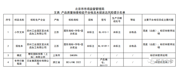 不合格名單中的蘇州工業園區亞太紙品加工有限公司在2020年還曾在北京市市場監督管理局的抽檢中,生產的小作文本和雙線本兩批次產品抽檢不合格,問題都是“亮度(白度)、標識和使用說明”。