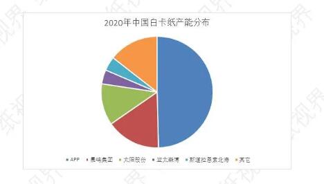 圖為2015-2020白卡紙年產能 我國白卡紙產能較為集中,截至2020年底,我國共有21家白卡紙生產企業,32條白卡紙生產線,年產能約1300萬噸,而APP集團、博匯、晨鳴集團、太陽“四大家族”產能共計達到1006萬噸,占總產能77.4%份額。 隨著2019年底APP金光集團收購博匯之后,白卡紙產能更加高度集中。目前僅APP金光集團在白卡紙市場占據49.6%的市場份額,坐穩了中國白卡紙市場“頭把交椅”,這必將使APP在未來的市場競爭中處于更加有利的地位。