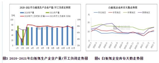 從利潤來看,如圖2所示,卓創資訊數據顯示,2021年3月份白板紙毛利率較2月增加6.43個百分點,較去年同期增加6.43個百分點。國廢黃板紙和廢舊書頁紙價格均沖高回落,3月下半月成本價格持續下跌,然白板紙價格上漲后維穩運行,因此紙廠毛利環比有所增加。 4月1日,規模紙廠領頭進行價格優惠100-200元/噸不等,其他中小紙企陸續跟進。卓創資訊數據監測,4月2日A級250g灰底白板紙含稅出廠日均價5667.5元/噸,較3月31日日均價下降2.37%。截止4月2日,250g白板紙市場主流成交含稅參考價5800-6100元/噸,成交重心緩慢下移。那么引起本次價格下滑的主要因素有哪些呢? 第一,從成本面來看,據卓創資訊監測數據顯示,3月國廢黃板紙均價為2409元/噸,月環比下跌3.10%,月同比上漲14.01%。3月國廢黃板紙市場價格沖高回落。價格回落的主要原因如下:1.國外疫情再次反彈;2.中美談話氣氛緊張;3.成品紙銷售大幅下降;4.廢紙打包站集中出貨套現;5.龍頭紙企護盤失敗后轉為領跌。 據卓創資訊監測數據顯示,3月國廢書本紙月均價為2518元/噸,月環比上漲3.75%,同比上漲22.54%;國廢報紙月均價為2906元/噸,月環比下跌2.62%,月同比上漲11.54%。3月國內廢舊書本紙價格沖高回落,廢舊報紙價格則呈高位下跌的格局。 整體來看,紙企面臨成品紙去庫存壓力,對廢紙的需求相對放緩。而在廢書本價格持續下調后,廢紙供應也有所減少,因此成本面無利好支撐。 第二,從供需面來看,節后紙廠多恢復正常生產,市場供應充足,然下游需求持續不佳,總體供應大于需求。如圖3、圖4所示,據卓創資訊監測數據顯示,2021年3月白板紙生產企業開工負荷率較2月份上升1.81%,較去年同期減少14.38個百分點。3月份產量較2月份上升13.65個百分比,較去年同期變化不大。卓創資訊根據對國內各省市代表性生產企業調研發現,3月份白板紙生產企業庫存持續窄幅增加,截至31日企業庫存量環比2月底上升10.97%左右,庫存天數在13天左右。