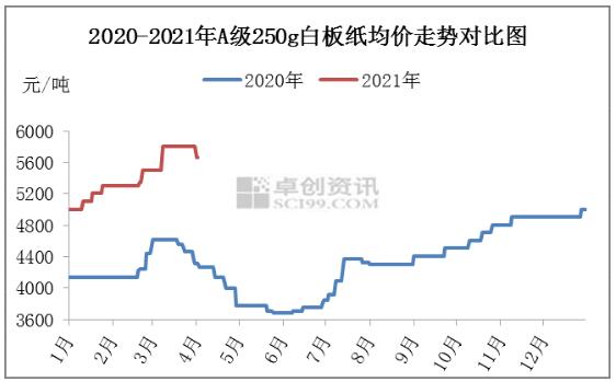 3月份白板紙價格先上漲后穩定,市場承壓運行,成交略顯清淡,多數業者持穩觀望紙市。卓創資訊數據監測顯示3月份A級250g灰底白板紙含稅出廠月均價5739.78元/噸,環比上升6.79%,同比上升26.11%。截止3月31日,250g白板紙市場主流成交含稅參考價5900-6200元/噸。