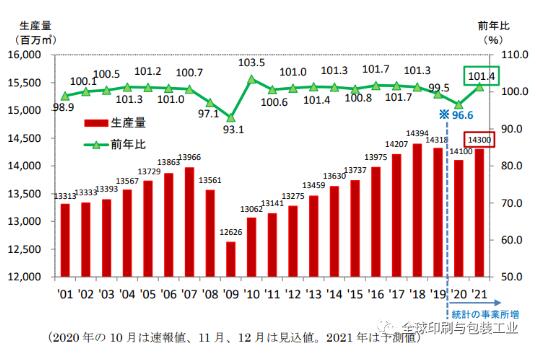 考慮到這種瓦楞紙板的需求趨勢和經濟前景,預計2021年,日本國內的瓦楞紙板需求量約143億平方米(比總量合計為上年的101.4%)。如果按月細分,預計1-3月為上年同期總量的99.0%,4-9月為上年同期總量的102.5%,10-12月為上年同期總量的101.5%。按需求部門劃分的趨勢如下: 預計“加工食品”(構成比為41%)將增長約2%,其中對家常便餐的需求穩定,并且從下半年開始逐漸用于商業用途。 預計“其他”(占總數的17%)將增長約1%,原因是老年人保健產品的增加,以及對家用紙張相關產品的穩定需求。 盡管存在諸如種植面積減少等不利因素,“水果和蔬菜”(組成比為10%)預計將增長約1%。 預計“用于電器和機械/器具”的銷售額(構成比為7%)將逐漸恢復,主要是汽車領域,并有望增長約2%。 預計“化學藥品/清潔劑/化妝品”(構成比為6%)將與上一年大致相同,因為可以通過建立新的生活方式來預期對化學藥品和清潔劑的需求,但對化妝品的內向需求不能滿足有望恢復。 “郵購/送貨/搬家”(構成比為5%)將增加約2%,這是因為在電商市場持續增長的同時,帶動了對瓦楞紙箱需求的增長,即便是疫情結束,這種趨勢仍將繼續維持。 根據日本造紙協會發布的預測,自2011年以來,日本國內對紙和紙板的需求一直處于下降趨勢。受到新冠疫情沖擊的2020年,更是加速了這種趨勢,同比上年下降了9.6%,這個下降速度也超過了之前2009年因雷曼兄弟破產而引發的金融海嘯而造成的行業下降,當時下降了9.2%。總體來說,主要是由于圖形紙需求的顯著減少和包裝紙需求(主要是包裝紙和白板紙)的減少所致。 談及2021年,由于數字化等結構性因素的下行將繼續為紙和紙板行業帶來壓力,預計在2020年由于新冠疫情而急劇下降的商業印刷會進一步加劇下滑,但也存在很大的不確定性。 另一方面,還有強大的需求領域,如在線購物。此外,由于居民在衛生意識方面的的提高,而且新冠疫情也導致了對生活用紙,尤其是紙巾需求的增加。當然,全球在禁塑令方面的推進,也有望增加紙張需求。 按產品總體統計,預計紙和紙板總量為2302萬噸,比上年增長0.4%。具體到各領域,預計圖形紙將減少0.8%,包裝紙將增加1.1%,衛生紙將增加1.0%。盡管預計紙和紙板的總量將在11年內首次增加,但與上一年的下降相比,增長率很小。此外,它將超過2000年峰值(3197萬噸)的70%。按照季度計算,預計1-3月為負數,但預計上年較低的4-6月和7-9月,增長率將為正,而10-12月預計與上年基本持平。