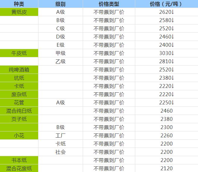四連跌📉:中南公司A級黃板紙四連跌,這是什么信號? 送貨東莞玖龍7月4日12點起(以第一次過磅時間為準)到廠價格如下: (1)甲級牛皮紙2880元; (2)乙級牛皮紙2660元; (3)A級:2470元/噸; (4)B級:2430元/噸; (5)C級:2370元/噸; (6)統貨(C級):2370元/噸; (7)D級:2310元/噸; (8)E級:2250元/噸; (9)純啤酒箱:2370元/噸; ...... 從7月1日始,中南公司A級黃板紙已經從2620降到2470元,出現4連跌。 2021年7月1日12點起,中南公司紙品收購價格調整為:  因國家的環保政策和大紙廠戰略性推升國廢,2017年以來的國廢價格一直是畸高的,從東南亞2600元/噸的成品瓦紙出廠價便可見一斑。 2017年的紙價瘋漲直接推升國廢,2018年大紙廠為清洗中小紙企更是將國廢抬高到3400元的天價,2020年以來,A級黃板紙從1800元慢慢爬升到2600元的高位。 此次國廢價格下調,主要還是市場進入淡季后的紙廠庫存壓力加大所致。也從另一個側面反映出紙廠仍然牢牢掌握著國廢的定價權。中國紙業國廢價格的四連跌,短期內將強化箱板紙和瓦楞原紙下行的預期。