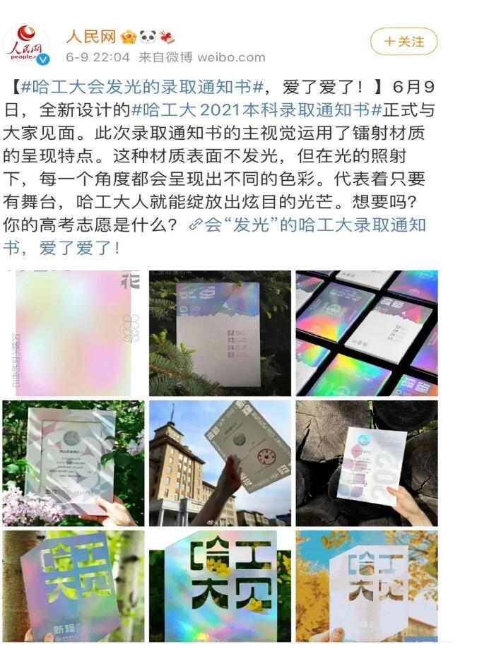 前陣子登上熱搜的 哈工大的錄取通知書會“發光” 這炫酷地鐳射質感設計 讓網友們大呼:愛了愛了!
