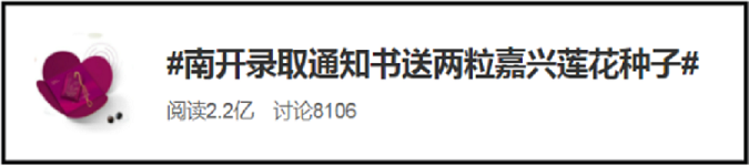 當然同樣登上熱搜榜的大學還有 南開大學 南開的錄取通知書以獨特的形式 在網上引起熱議 #南開錄取通知書送兩粒嘉興蓮花種子#▼