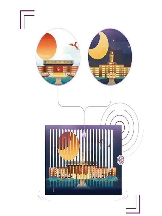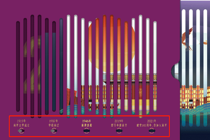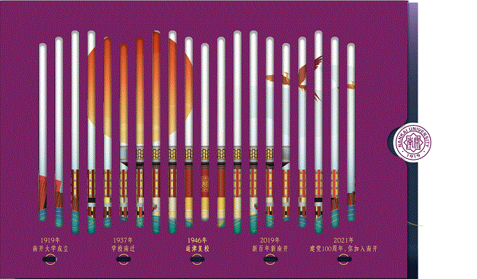 通知書的設計也很贊 移動封面右側的校徽 根據封面的豎條鏤空交錯 形成日月同輝的視覺特效  白天以圖書館為標志 夜晚以月光下的主樓為標志  封面底部的字 則記錄了南開大學的重要事件和年份