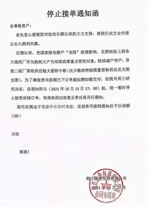 浙江怡佳包裝有限公司 從10月13日17點起,統一暫時停止接受后續訂單,待原紙供應恢復正常后再另行通知。