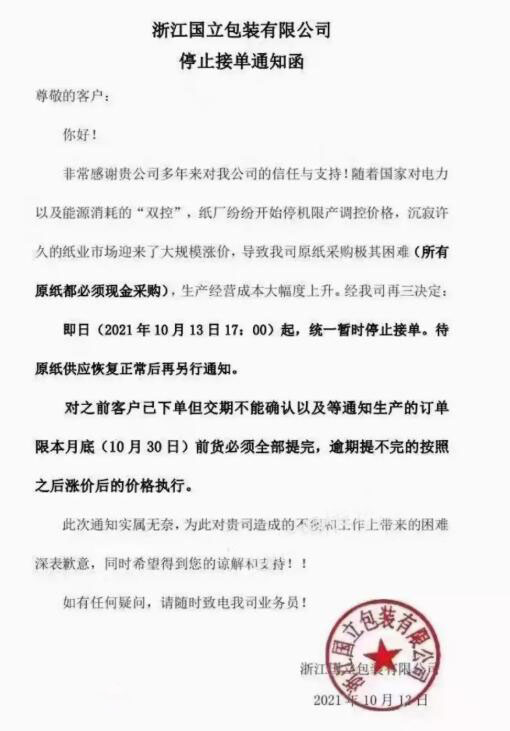 就在紙廠大規模漲價的當下,新的狀況又在困擾著紙包裝企業。據悉,隨著能源雙控政策的深入,原紙供應逐漸緊缺,浙江多家包裝企業在日前宣布,統一暫時停止接單,待原紙供應恢復正常后再另行通知。 浙江國立包裝有限公司 從10月13日起,統一暫時停止接單,待原紙供應恢復正常后再另行通知。