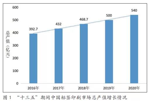 標(biāo)簽印刷市場發(fā)展現(xiàn)狀 1. 產(chǎn)值概況 “十三五”期間,全球標(biāo)簽印刷市場總產(chǎn)值以約 5%的年復(fù)合增長率穩(wěn)定增長著,2020 年達到 432.5 億美元。預(yù)計“十四五”期間,全球標(biāo)簽市場仍將以約 4%~ 6%的年復(fù)合增長率持續(xù)增長,預(yù)計到 2024 年總產(chǎn)值將達到 499 億美元。 中國作為全球最大的標(biāo)簽生產(chǎn)國和消費國,近五年來市場增長速度迅猛,從“十三五”初標(biāo)簽印刷工業(yè)總產(chǎn)值 392.7 億元增長至 2020 年 540 億元(如圖1所示),年復(fù)合增長率達到 8% ~ 10%,預(yù)計到 2021 年末將增至 600 億元,是全球增速最快的標(biāo)簽市場之一。