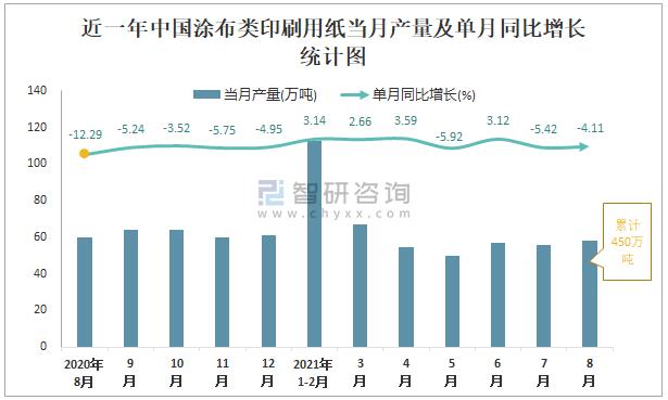 根據國家統計局數據顯示:2021年8月中國涂布類印刷用紙產量為58萬噸,同比下降4.11%;2021年1-8月中國涂布類印刷用紙累計產量為450萬噸,同比增長0.34%;2015-2020年中國涂布類印刷用紙產量2019年達到最高,次年有所下滑。