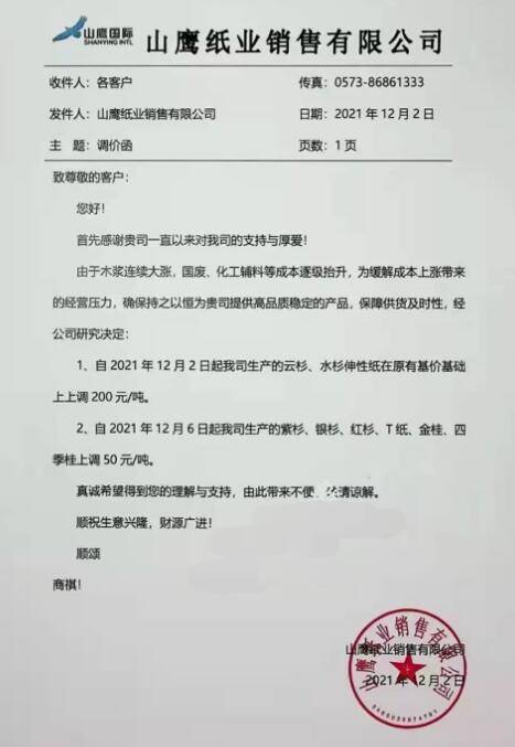 漲價函顯示,12月2日起,山鷹紙業生產的云杉、水杉伸性紙在原有基價基礎上上調200元/噸;12月6日起,山鷹紙業生產的紫杉、銀杉、紅杉、T紙、金桂、四季桂上調50元/噸。