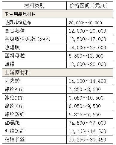 來源:生活用紙雜志 熱風非織造布價格約為2萬~4萬/t,比10月略有上調。 復合芯體價格約為1.2萬~2.0萬/t,與10月相比,上漲10%左右,主要是由于上游原材料價格上漲及市場因素導致。 高吸收性樹脂(SAP)價格約為1.25萬~1.7萬/t,與10月相比略有上調或持平。2021年第三季度丙烯酸價格大幅上漲,SAP不能及時反映成本,價格倒掛嚴重,有企業被迫減產應對。近期丙烯酸價格逐漸下調,但仍處于高位。 熱熔膠價格約為1.3萬~2.3萬/t,常規產品價格保持平穩,由于上游原材料價格處于高位,導致市場競爭加劇,部分高端產品價格漲幅在10%左右。 薄膜價格約為1.2萬~2.6萬/t,與10月相比漲幅約為5%,主要是由于上游PE材料價格上漲導致的。 塑料母粒價格約為0.85萬~1.3萬/t,與10月相比,市場供應充足,同時整體期貨價格下調,供需不平衡得到緩解,價格開始回落。 對于紙尿褲原料的持續漲價,有業內人士較為淡然,認為該情況將在明年1月回緩。然而,上游若是無底線的持續漲價,勢必會對中小企業造成影響。明年紙尿褲行業走勢以及原料價格將發生何種變化,讓我們拭目以待。