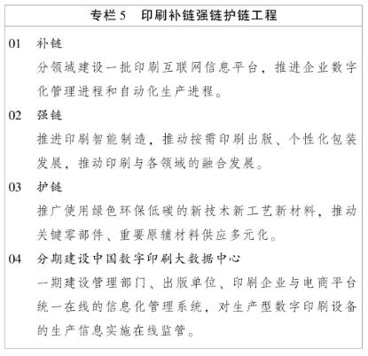 。ㄈ┓诸惒季纸ㄔO裝備器材創新高地。加快重大技術裝備工程化產業化突破,支持浙江(溫州、杭州)、北京、上海、廣東(廣州、東莞)建設印刷機械制造創新基地,陜西(渭南、西安)建設包裝印刷機械制造創新中心,天津、深圳建設印后裝備制造創新中心,河南(南陽)建設綠色版材創新中心,江蘇(蘇州、泰州)建設綠色原輔材料創新中心。加強統籌規劃,建設完善印刷裝備技術創新信息交流平臺。 四、穩步提升產業鏈供應鏈現代化水平 堅持自主可控、技術先進、安全高效,推動全印刷產業鏈供應鏈優化升級,推進產業基礎高級化、產業鏈現代化。 。ㄒ唬┡嘤龎汛簖堫^骨干企業。實施國家印刷示范企業培育工程,增強要素保障能力,培育壯大具有生態主導力和核心競爭力的“鏈主”或龍頭企業,培育壯大細分領域單項冠軍企業。支持中小企業向“專精特新”方向發展,培育壯大中小特色競爭企業。支持優質企業上市。實施產業鏈供應鏈質量提升行動,提高標準化精細化信息化管理水平,推動企業創品牌、提品質,加快高端化智能化綠色化發展。 。ǘ┙ㄔO先進產業集群。依托國家印刷示范企業、龍頭骨干企業、產業基地園區等優勢資源,在合理服務半徑內,加強產業鏈供應鏈合作協同,引導規劃建設數字印刷、印刷智能制造、印刷融合發展、印刷綠色發展、印刷裝備器材、印刷戰略新興等產業集群。健全產業集群組織管理和專業化推進機制,優化集群布局和結構調整,增強產業集群的規模優勢和比較優勢。 。ㄈ⿻惩óa業循環。實施全印刷補鏈強鏈護鏈工程,加強政策措施和市場機制的統籌協調,加快標準統一制定和應用升級,加強產業鏈供應鏈與創新鏈、資金鏈、信息鏈的深度融合,推動產業鏈供應鏈向專業化和價值鏈高端延伸。建設中國數字印刷大數據中心。發揮我國印刷業的規模優勢、配套優勢,形成供給有效、安全可靠的全印刷產業鏈供應鏈,提高服務效率和品質,為我國經濟內循環提供有力支撐。