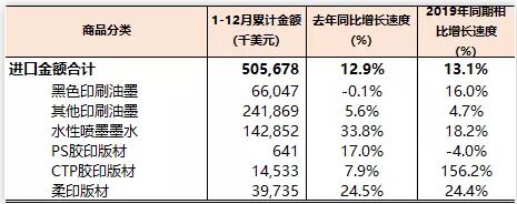 同期,國內(nèi)印刷裝備進出口貿(mào)易順差4.18億美元(同比下降15.0%、較2019年同期下降14.4%)。 國內(nèi)印刷器材進出口概況 2021年1-12月國內(nèi)印刷器材進口5.06億美元(參見表6),同比增長12.9%、較2019年同期增長13.1%。其中,黑色印刷油墨1980.72噸、6604.7萬美元(同比下降0.1%、較2019年同期增長16.0%)、其他印刷油墨8808.52噸、2.42億美元(同比增長5.6%、較2019年同期增長4.7%)、水性噴墨墨水7310.93噸、1.43億美元(同比增長33.8%、較2019年同期增長18.2%)、PS膠印版材3.22萬平方米、64.1萬美元(同比增長17.0%、較2019年同期下降4.0%)、CTP膠印版材319.30萬平方米、1453.3萬美元(同比增長7.9%、較2019年同期增長156.2%)、柔印版材75.67萬平方米、3973.5萬美元(與上年增長24.5%、較2019年同期增長24.4%)。 表6 2021年1-12月 國內(nèi)印刷器材進口統(tǒng)計