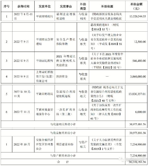 12月1日,浙江榮晟環(huán)保紙業(yè)股份有限公司(下文簡稱:榮晟環(huán)保)發(fā)布公告稱,自2022年8月24日至11月29日,公司及子公司累計收到政府補助38,210,781.56元(未經(jīng)審計)。