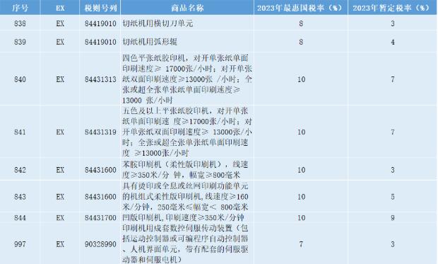表1 《部分信息技術產品最惠國稅率表》與印刷設備器材相關的調整 1、印刷版材、印前設備類產品最惠國關稅繼續為零 在2019年7月1日之后,“激光照排片(任何一邊超過255mm),用紙、紙板及紡織物以外任何材料制成”“PS版(預涂感光版)(任何一邊超過255mm),用紙、紙板及紡織物以外任何材料制成”“CTP版”“柔性印刷版”等印刷版材類產品實施的最惠國稅率已經為零;“鑄字機”“計算機直接制版設備”“其他制版機器、器具及設備”“其他鑄字、制版用機器、器具及設備”等印前設備類產品實施的最惠國稅率也已經為零。2023年全年,以上產品實施的最惠國稅率依然為零。 2、數字印刷設備類產品關稅進一步下降,全產品實現零關稅 在2021年7月1日以后,“可以網絡連接的噴墨印刷機”“可以網絡連接的靜電照相印刷機(激光印刷機)”“可以網絡連接的其他數字印刷設備”等數字印刷設備類產品實施的最惠國稅率均已降為零。2023年全年,以上產品實施的最惠國稅率依然為零。 在2023年7月1日之前,“其他獨立的噴墨印刷機”“其他獨立的靜電照相印刷機(激光印刷機)”“其他獨立的數字印刷設備”等數字印刷設備類產品實施的最惠國稅率均為1.0%,但在2023年7月1日以后,三類產品的關稅將降為零。至此,數字印刷設備類產品全部實現零關稅。 3、印刷設備零配件及輔助設備關稅維持零關稅 除印刷版材類產品、印前設備類產品實施的最惠國稅率為零,數字印刷類產品的實施的最惠國稅率持續下降外,一些傳統和數字印刷設備的零配件、輔助設備等,繼續維持零關稅。 綜上,在《部分信息技術產品最惠國稅率表》中,截至2023年7月1日前,除“其他獨立的噴墨印刷機”“其他獨立的靜電照相印刷機(激光印刷機)”“其他獨立的數字印刷設備”等數字印刷設備類產品外,其余與印刷設備與器材相關的產品在2022年全年維持零關稅。 自7月1日起,所有與印刷設備與器材相關的產品將實現零關稅。 二、《進口商品暫定稅率表》中印刷相關產品稅率的調整 根據最新發布的《進口商品暫定稅率表》顯示,與印刷設備及器材相關的部分產品在2023年1月1日以后,最惠國稅率沒有調整,保持穩定(見下表)。