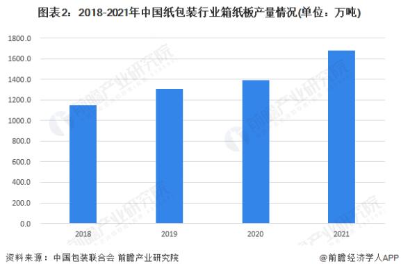 箱紙板是紙包裝行業的重要基礎材料及包裝材料,根據中國包裝聯合會數據,2018-2021年中國紙包裝行業箱紙板產量呈不斷增長態勢,2021年產量規模達到1680.40萬噸,同比增長20.48%。