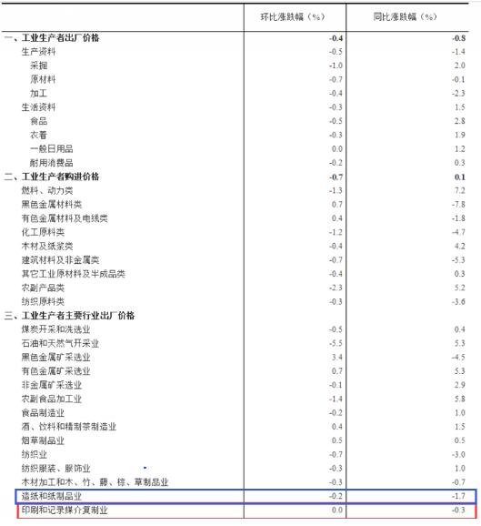 其中,造紙和紙制品業工業生產者出廠價格同比下降1.7%,印刷和記錄媒介復制業工業生產者出廠價格同比下降0.3%。