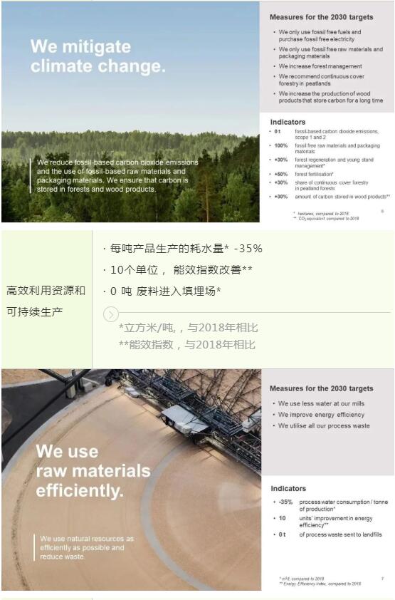 芬林集團還致力于減少其化石燃料二氧化碳排放,以緩解氣候變化。芬林集團的工廠將完全過渡到零化石燃料生產,包括公司從外部購買的所有電力和熱能也將實現這種過渡。用于產品和包裝材料的原料將僅由無化石的材料組成。