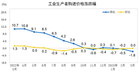 2023年3月份,全國工業生產者出廠價格同比下降2.5%,環比持平;工業生產者購進價格同比下降1.8%,環比持平。一季度,工業生產者出廠價格比去年同期下降1.6%,工業生產者購進價格下降0.8%。