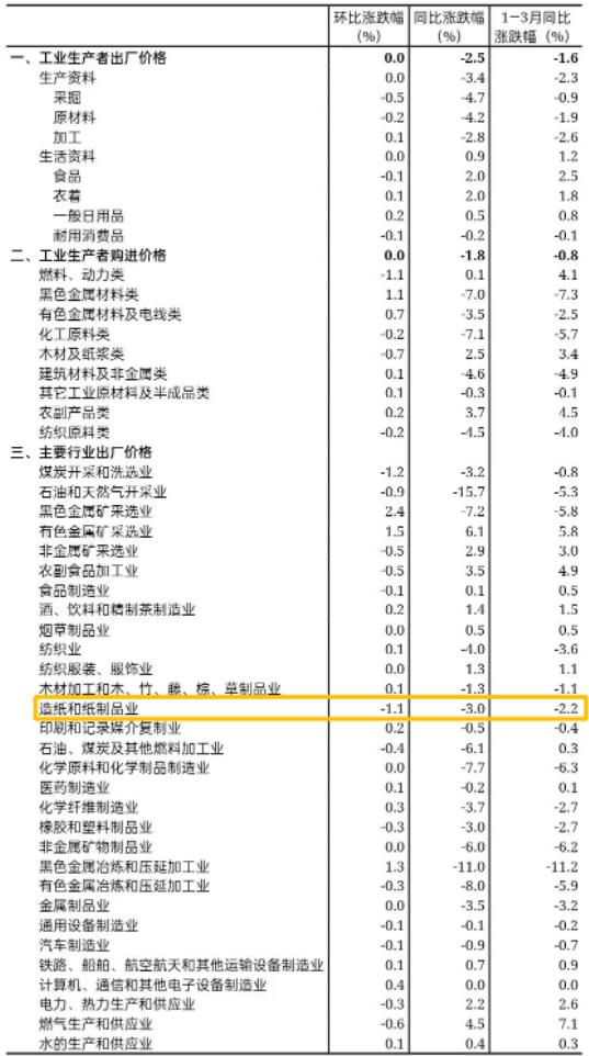 值得注意的是,主要行業出廠價格中,造紙和紙制品業環比下降1.1%,同比下降3%,1-3月同比下降2.2%。