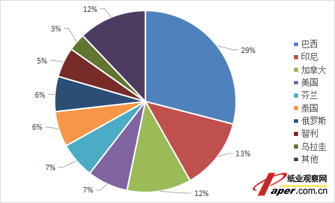 根據紙業觀察網統計,5月我國紙漿主要進口來源國分別為巴西、印尼、加拿大、美國、芬蘭、泰國、俄羅斯、智利、烏拉圭等。其中,巴西以91.55萬噸位居首位,占比達到了29.01%;其次為印尼,為40.34萬噸,占比為12.78%;再次為加拿大,為36.18萬噸,占比為11.46%。