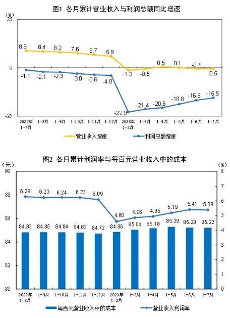 1—7月份,規模以上工業企業實現營業收入73.22萬億元,同比下降0.5%;發生營業成本62.40萬億元,增長0.2%;營業收入利潤率為5.39%,同比下降0.95個百分點。