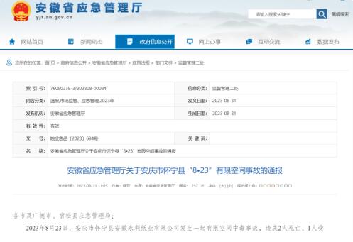 根據通報,2023年8月23日,安慶市懷寧縣安徽永利紙業有限公司發生一起有限空間中毒事故,造成2人死亡、1人受傷。