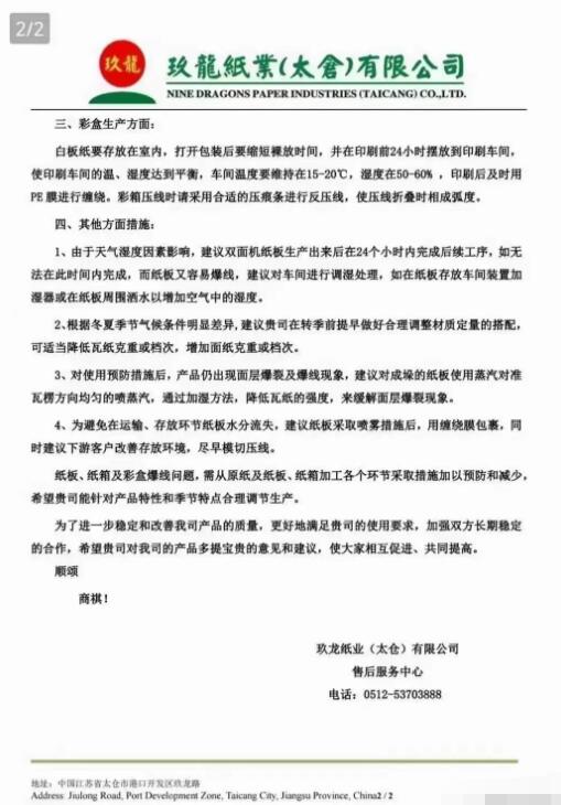 秋冬季節(jié)來臨,為避免由于外界環(huán)境溫濕度的變化給紙板、紙箱及彩盒的生產(chǎn)造成不必要的麻煩和損失,玖龍紙業(yè)近期發(fā)布了《關(guān)于秋冬季節(jié)預(yù)防紙箱爆線的函》,希望能與廣大包裝企業(yè)采取措施預(yù)防紙箱爆線問題。