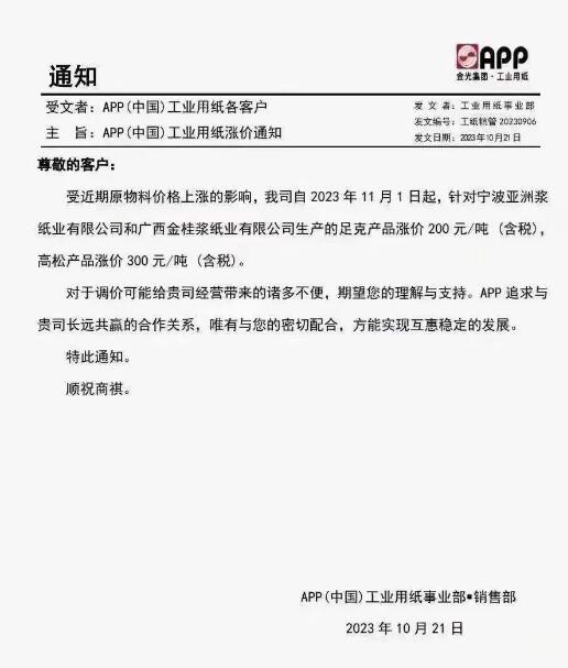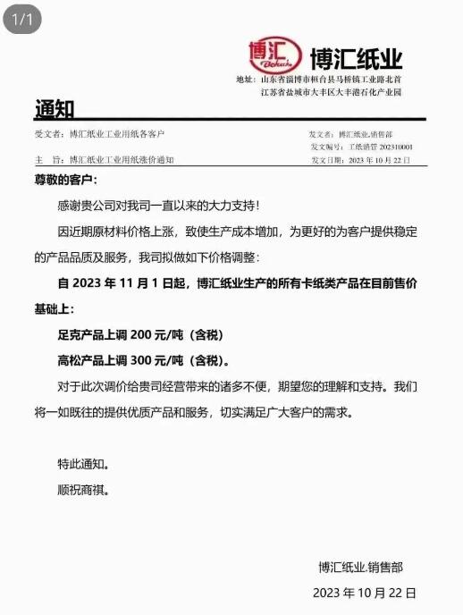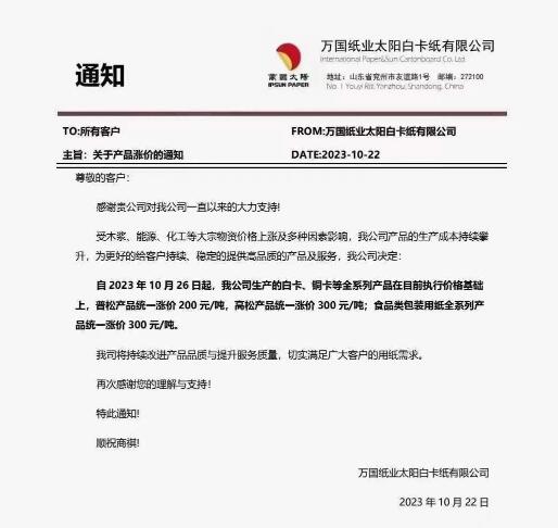 白卡紙加入漲價隊伍 四大巨頭上漲200-300元/噸