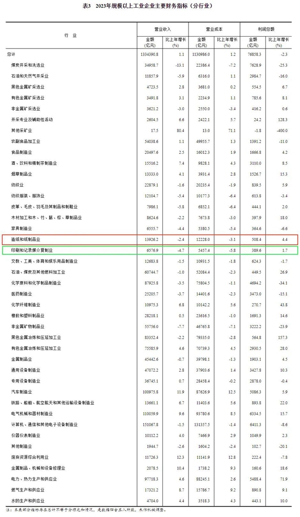 2023年,規模以上工業企業實現營業收入133.44萬億元,比上年增長1.1%;發生營業成本113.10萬億元,增長1.2%;營業收入利潤率為5.76%,比上年下降0.20個百分點。其中,造紙和紙制品業實現營業收入13926.2億元,同比下降2.4%;印刷和記錄媒介復制業實現營業收入6576.9億元,同比下降4.7%。 2023年末,規模以上工業企業資產總計167.36萬億元,比上年增長6.0%;負債合計95.57萬億元,增長5.9%;所有者權益合計71.79萬億元,增長6.2%;資產負債率為57.1%,比上年下降0.1個百分點。 2023年末,規模以上工業企業應收賬款23.72萬億元,比上年增長7.6%;產成品存貨6.14萬億元,增長2.1%。 2023年,規模以上工業企業每百元營業收入中的成本為84.76元,比上年增加0.04元;每百元營業收入中的費用為8.56元,比上年增加0.20元。 2023年末,規模以上工業企業每百元資產實現的營業收入為82.4元,比上年減少4.9元;人均營業收入為181.5萬元,比上年增加5.9萬元;產成品存貨周轉天數為19.3天,比上年增加0.9天;應收賬款平均回收期為60.6天,比上年增加4.4天。 12月份,規模以上工業企業實現利潤同比增長16.8%。 國家統計局工業司統計師于衛寧解讀工業企業利潤數據表示,2023年,國內需求逐步改善,工業生產穩步回升,規模以上工業企業效益持續恢復,主要行業利潤積極改善,新動能培育壯大,工業經濟高質量發展基礎進一步鞏固。超六成行業全年利潤實現增長,七成行業利潤呈回升態勢。2023年,在41個工業大類行業中,有27個行業利潤比上年增長,利潤增長面為65.9%,比上年擴大12.2個百分點;有29個行業全年利潤增速比1—11月份加快或降幅收窄、由降轉增,呈回升態勢,占70.7%。
