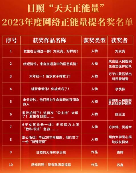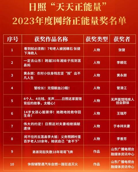 正能量活動讓全民沉浸在積極向上的氛圍中,打破了以往評選活動面向特定群體的限制,把目光聚焦凡人善舉、發展貢獻、城市之美等主題,把推舉評選的權力讓渡給群眾,把群眾身邊的正能量典型亮出來,極大地增強了評選活動的公信力和群眾對典型事跡的認同感。比如,暖心的無聲面館、幫助與家人失散18年的顏河回家等,雖然事跡沒有多么“高大上”,但都因“有血有肉”,得以“出圈出彩”。 截至目前,活動已累計評選“天天正能量”典型137期,評選出網絡文明典型160余組,舉辦頒獎儀式12次,成功策劃推出微博抖音正能量熱搜話題90余個,在全網收獲了超過30億的閱讀量。在2023年中國網絡文明大會網絡文明國際交流互鑒論壇上,日照成功入選2023網絡文明典型案例城市并作典型發言。 “天天正能量”活動如春雨潤物,讓城市的美好與溫暖深入人心,贏得認同與喜愛,日益增長的熱度與溫度,有力提升了城市知名度和美譽度,成為鮮明的城市“品牌”。 2023年度日照“天天正能量”頒獎典禮圓滿落幕,2024年度正能量接續澎湃,在春暖花開的季節,我們播撒正能量的“種子”,來年必會收獲更多的“花團錦簇”。