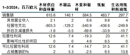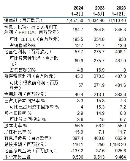 2024年1-3月(2023年1-3月同比數據) 銷售額為14.57億歐元(同比:16.34億歐元) 經營性利潤為0.58億歐元(同比:2.76億歐元);可比經營性利潤為0.7億歐元(2.76億歐元) 稅前利潤為0.45億歐元(同比:2.71億歐元);可比稅前利潤為0.57億歐元(同比:2.72億歐元) 可比已占用資本回報率為4.0%(同比:15.3%) 經營性凈現金流為-1.37億歐元(同比:0.38億歐元) 2024年第一季度主要事件 相較于2023年第四季度,芬林集團長纖漿在歐洲平均銷售價格有所上漲,在中國小幅下降。 歐洲及北美對商品漿需求上漲。中國市場需求平穩向好。 市場對芬林集團紙板產品的需求較2023年第四季度大幅增加。折疊紙板平均價格下降。 3月,芬林紙板做出決策,將不在芬蘭卡斯基寧(Kaskinen)投資興建紙板廠。 2024年3月11日至4月8日期間,在芬蘭發生的政治罷工導致貨物運輸及出口港口停擺。罷工對芬林集團經營利潤產生負面影響,13家工廠停工。 凱米生物制品廠蒸發車間發生的氣爆事故所導致的停工預計將持續至六月底。凱米紙板廠生產也將受其影響。 芬林生活用紙曼塔(Mänttä)工廠正在計劃實施一項為期五年、價值1億歐元的投資項目。 芬林集團和安德里茨決定在芬蘭艾內科斯基合作建造示范工廠,開發新的木質素產品。 芬林集團啟動建造Muoto包裝工廠的前期工程設計工作,以及建造Kuura紡織纖維工廠的預可行性研究。 2024年4-6月的業績預測 芬林集團2024年4-6月的可比經營性利潤預計將低于2024年1-3月。 1-3月回顧期結束后發生的事件 芬林芬寶梅里卡爾維亞鋸材廠于4月關廠。 4月,芬林紙板做出投資決策,投入約0.6億歐元用于辛佩萊(Simpele)折疊紙板廠的設備現代化改造。改造工程預計于2025年下半年完成。