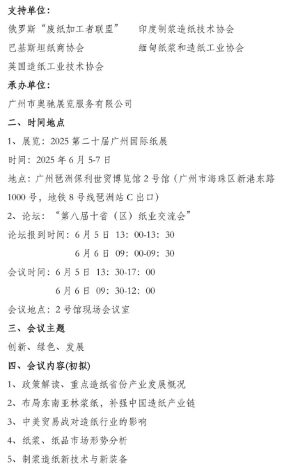 由廣東、山東、河南、浙江、四川、廣西、江西、湖北、福建、江蘇、河北、山西、云南、湖南等造紙協(學)會主辦的2025第二十屆廣州國際紙展暨生活用紙展,將于6月5日-7日,在廣州琶洲保利世貿博覽館召開。 展會得到了俄羅斯廢紙回收聯盟、印度制漿造紙協會、巴基斯坦紙商協會、緬甸制漿造紙協會、英國造紙協會的支持。 展會以品牌展示、采購對接、現場交流、專業論壇等形式,為參展企業和采購商搭建專業的商貿平臺,挖掘和拓展更多合作機會。 展會以“紙貿全球”為主題,匯聚200多家國內外品牌企業,展示紙制品行業的創新產品和技術,涵蓋制漿造紙、紙業、特種紙、造紙化學品、衛生用品、生活用紙等,為觀眾帶來更多選擇和靈感。