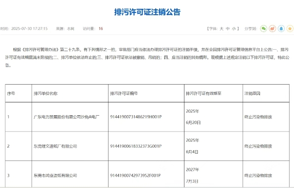 東莞理文造紙廠、東莞市鴻業造紙排污許可證被注銷