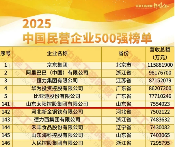8月28日,2025中國民營企業500強發布會暨全國優強民企助力遼寧全面振興新突破大會在遼寧召開,會上發布了“2025中國民營企業500強”“2025中國制造業民營企業500強”等榜單。其中,公司控股股東山東太陽控股集團有限公司榮列“2025中國民營企業500強”第141位,榮列“2025中國制造業民營企業500強”第101位,排名均實現穩步提升,企業的發展質量、效益和核心競爭力顯著增強,高質量發展邁上新臺階。