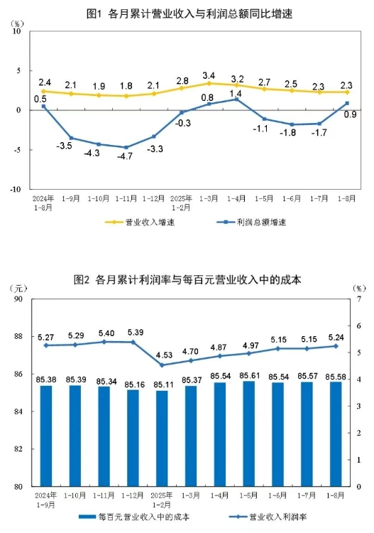 1—8月份,規模以上工業企業實現營業收入89.62萬億元,同比增長2.3%;發生營業成本76.70萬億元,增長2.5%;營業收入利潤率為5.24%,同比下降0.06個百分點。其中,造紙和紙制品業實現營業收入9167.1億元,同比下降1.9%;印刷和記錄媒介復制業實現營業收入4215.7億元,同比下降1.0%。 8月末,規模以上工業企業資產總計185.08萬億元,同比增長5.0%;負債合計107.34萬億元,增長5.4%;所有者權益合計77.73萬億元,增長4.4%;資產負債率為58.0%,同比上升0.2個百分點。 8月末,規模以上工業企業應收賬款27.24萬億元,同比增長6.6%;產成品存貨6.73萬億元,增長2.3%。 1—8月份,規模以上工業企業每百元營業收入中的成本為85.58元,同比增加0.19元;每百元營業收入中的費用為8.37元,同比減少0.08元。 8月末,規模以上工業企業每百元資產實現的營業收入為74.0元,同比減少2.0元;人均營業收入為183.5萬元,同比增加5.7萬元;產成品存貨周轉天數為20.5天,同比增加0.1天;應收賬款平均回收期為70.1天,同比增加3.7天。 8月份,規模以上工業企業利潤同比由上月下降1.5%轉為增長20.4%。 國家統計局工業司首席統計師于衛寧解讀2025年1—8月份工業企業利潤數據表示,1—8月份,在宏觀政策發力顯效、全國統一大市場縱深推進,疊加去年同期低基數等多重因素作用下,規模以上工業企業利潤同比增長0.9%,裝備制造業支撐有力,不同規模企業利潤均有所改善。工業企業利潤明顯改善;工業企業營收保持穩定增長;裝備制造業“壓艙石”作用明顯;原材料制造業利潤增長較快,消費品制造業利潤由降轉增;不同規模企業利潤均有改善,私營企業利潤明顯加快;8月企業單位成本下降,營收利潤率回升。