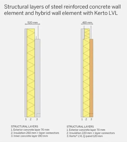 而在墻體結(jié)構(gòu)中,兩者的差異表現(xiàn)為: Kerto LVL 的化石氣候影響(單位:CO₂e/m²,二氧化碳當(dāng)量 公斤/平米)為 52 kg CO₂e/m²,鋼筋混凝土為 68 kg CO₂e/m²。 材料使用量(單位kg/m²,公斤/平米)分別為 60 kg/m² 與 463 kg/m²,Kerto LVL 減少了超過80%的材料重量。