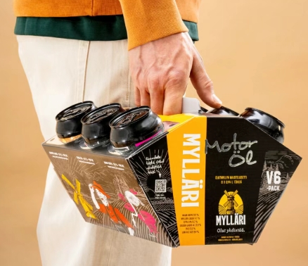 奧露畝 (Olutmylly) 是一家位于芬蘭福爾薩(Forssa)的家族釀酒廠。自2020年品牌重塑以來,企業敏銳地意識到,在競爭激烈的市場中脫穎而出不僅需要優質產品,更要在貨架上“吸睛”。幸運的是,奧露畝與芬林紙板的創意包裝設計團隊展開合作,最終呈現出令人驚艷的成果。 奧露畝總經理安妮·西爾馬拉(Anne Silmälä)笑著說: 我們的新品啤酒品鑒包裝絕對是最酷的六瓶裝!這款包裝不僅展示了我們精選的六款啤酒,更將品牌形象提升到了一個新高度。它在視覺和功能上都非常出色,我第一次看到設計方案時就被震撼到了。這個創意非常獨特,而最終呈現的效果也完全符合我們最初設定的高標準。 釀酒師米科·西爾馬拉(Mikko Silmälä)也表示: 這次合作是一次徹底的成功。罐裝啤酒被包裝得像引擎活塞一樣,啤酒的選擇也非常精致。 芬林紙板包裝平面設計師馬爾科·萊維斯卡(Marko Leiviskä)則稱這次合作是“天作之合”。他回憶道: 從2024年12月提出初步構想開始,我們的進展非常迅速。小型企業在包裝解決方案方面更具靈活性,也更愿意在設計上大膽突破,這次合作正是如此。 引擎造型,點燃激情! 萊維斯卡的設計靈感源自汽車引擎——一個V型結構,正好容納六瓶啤酒。他說:“我覺得這個設計會深受那些喜歡改裝汽車、偶爾小酌的人群歡迎。后來我發現奧露畝的客戶中就有不少來自賽車圈,這一切仿佛都是命中注定。我們成功打造了一款專屬特定人群的產品!